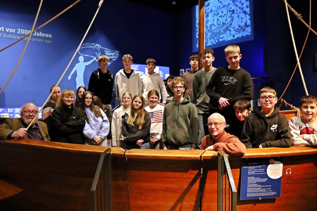 In der Mittagspause durften die Jugendlichen über den Frankfurter Weihnachtsmarkt an Römer und Paulskirche schlendern, bevor ein weiteres Erlebnismuseum auf sie wartete. Das Bibelhaus ErlebnisMuseum befindet sich in einer ehemaligen Kirche nahe dem Frankfurter Museumsufer. Es zeigt die Überlieferung, Lebenswelt und aktuelle Bedeutung der Bibel mit archäologischen Funden, thematischen Inszenierungen und vielen Mitmach-Elementen. Die Jugendlichen waren Gäste und Gastgeber im Zelt bei Nomaden zu Zeiten Abrahams. Sie erlebten, welche Bedeutung die sozialen und familiären Strukturen damals hatten und wie eine biblische Geschichte weitergegeben wurde, lange bevor sie aufgeschrieben wurde. Danach lernten die Konfirmandinnen und Konfirmanden anhand von Fundstücken aus der Zeit Jesu etwas über die Lebenswirklichkeit in Judäa vor 2000 Jahren. Zum Abschluss spielten die Jugendlichen die biblische Geschichte von „Jesus und der Sturm“ in einer Nachbildung eines ca. 2000 Jahre alten Fischerbootes, das am See Genezareth gefunden wurde, nach. In der Geschichte ist Jesus mit seinen Jüngern auf dem See in einem Boot unterwegs, als ein heftiger Sturm aufkommt, die Jünger in Panik geraten, Jesus aber erwacht und den Sturm mit einem Wort beruhigt. Das Ende eines anstrengenden, aber sehr lehrreichen Tages, in denen die Jugendlichen in andere Lebenswelten eintauchen konnten.